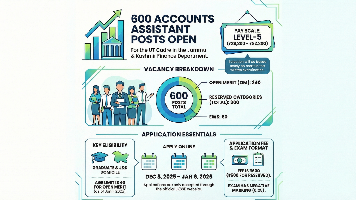 JKSSB Accounts Assistant Recruitment 2026: The Jammu and Kashmir Services Selection Board (JKSSB) has released a latest job notification for 2026. They are hiring for 600 Accounts Assistant posts as per the Advertisement No. 10 of 2025. This is a big chance for people who have completed their Graduation or Ph.D to get a government job in J&K. JKSSB Accounts Assistant Recruitment 2026 online application started on 8th December 2025, and you can apply until 6th January 2026. If you are looking for JKSSB Jobs, this is the one for you. We have added all the details regarding age, fees, and how to apply in this blog below for your quick reference.